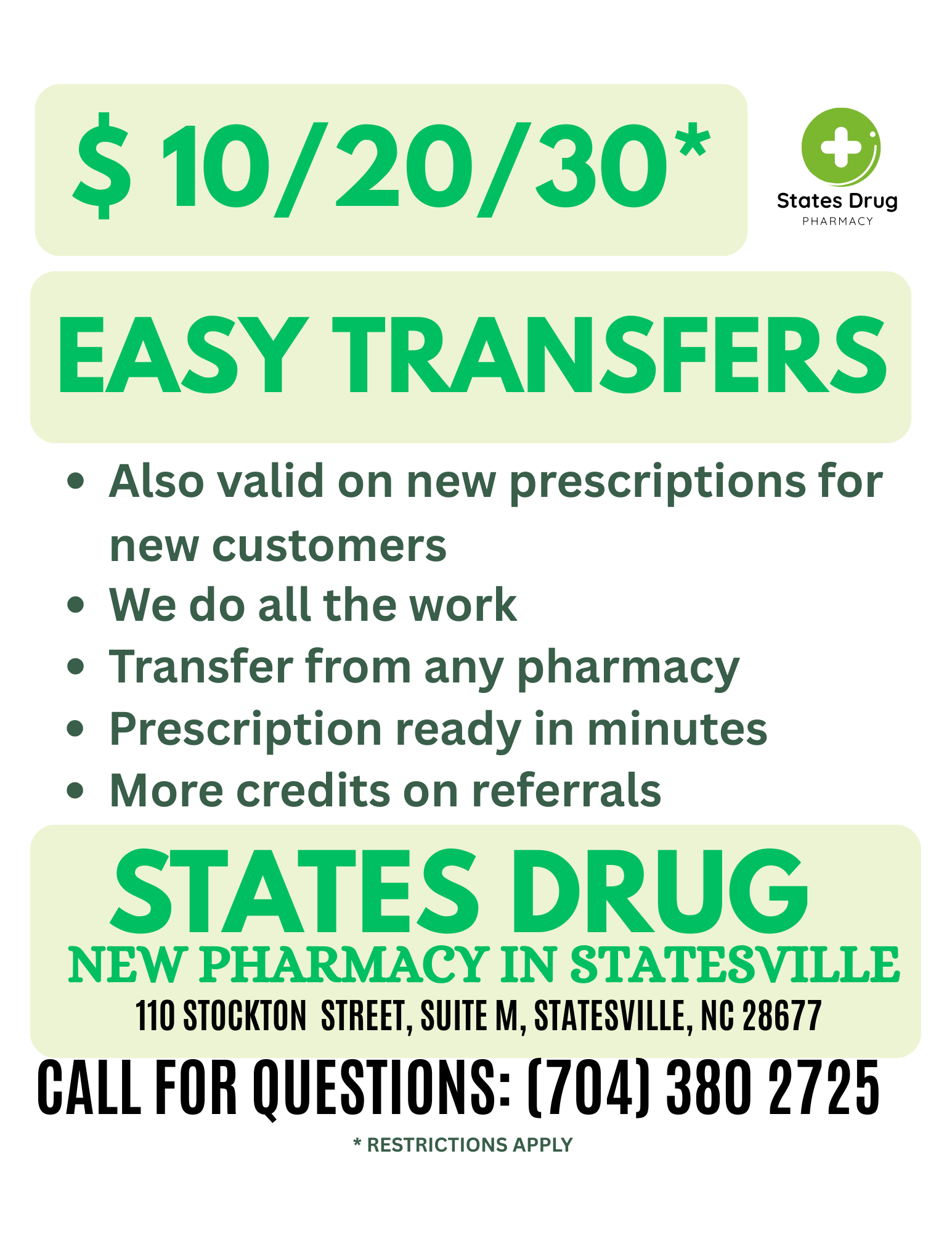 For prescription medicine transfers and refills, please give us a call. All you have to do is give your data and we will get your prescriptions transferrred. they will be ready before you walk in the store. or if you prefer them deilivered, let us know ALWAYS REMEMBER, YOU HAVE THE RIGHT TO CHOOSE YOUR PHARMACY, NO MATTER WHAT, INCLUDING MEDICAID INSURED CUSTOMERS(locked in patients can chose to change)